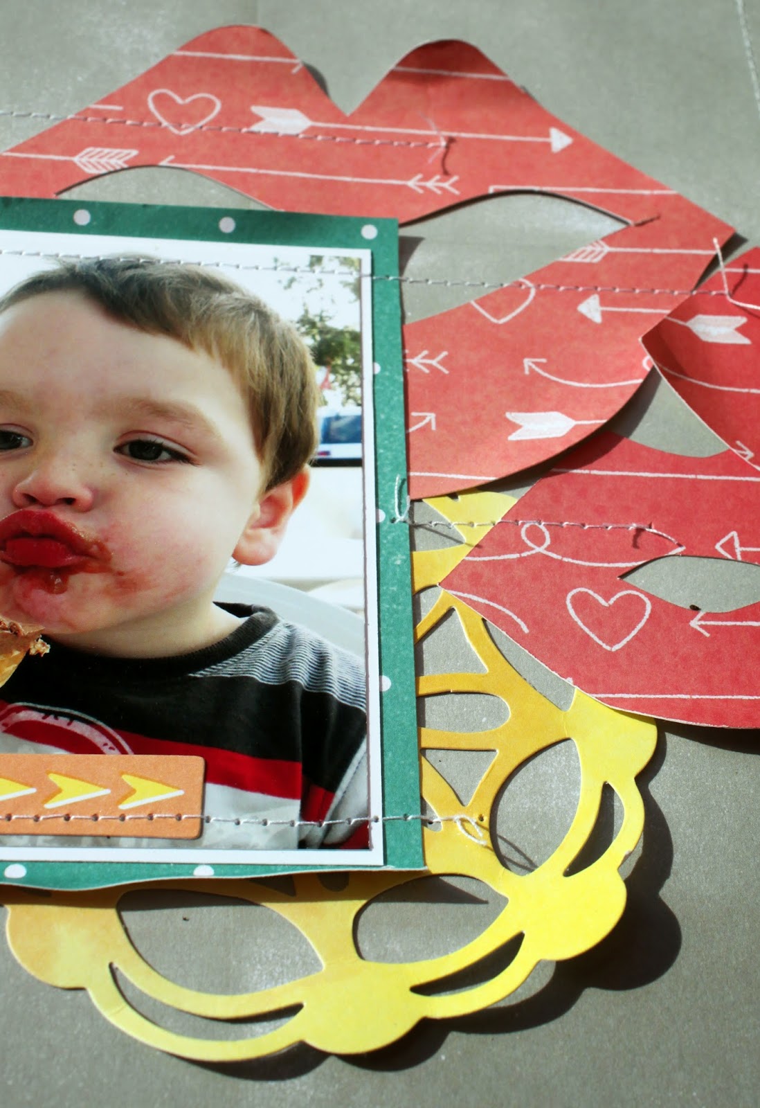 I will admit I struggled with this sketch- it's nowhere near my usual scrapbooking style. But I had an "a-ha" moment and decided to use giant lips in place of the circles in the sketch! I cut them with my Silhouette using a file from the Silhouette store and with papers from Amy Tangerine's Yes Please collection, it all came together quite nicely.